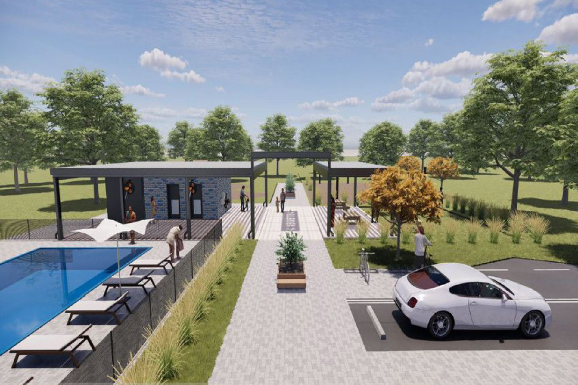 Amenidades tipo resort, como piscina estilo resort y parque comunitario con senderos y áreas verdes.